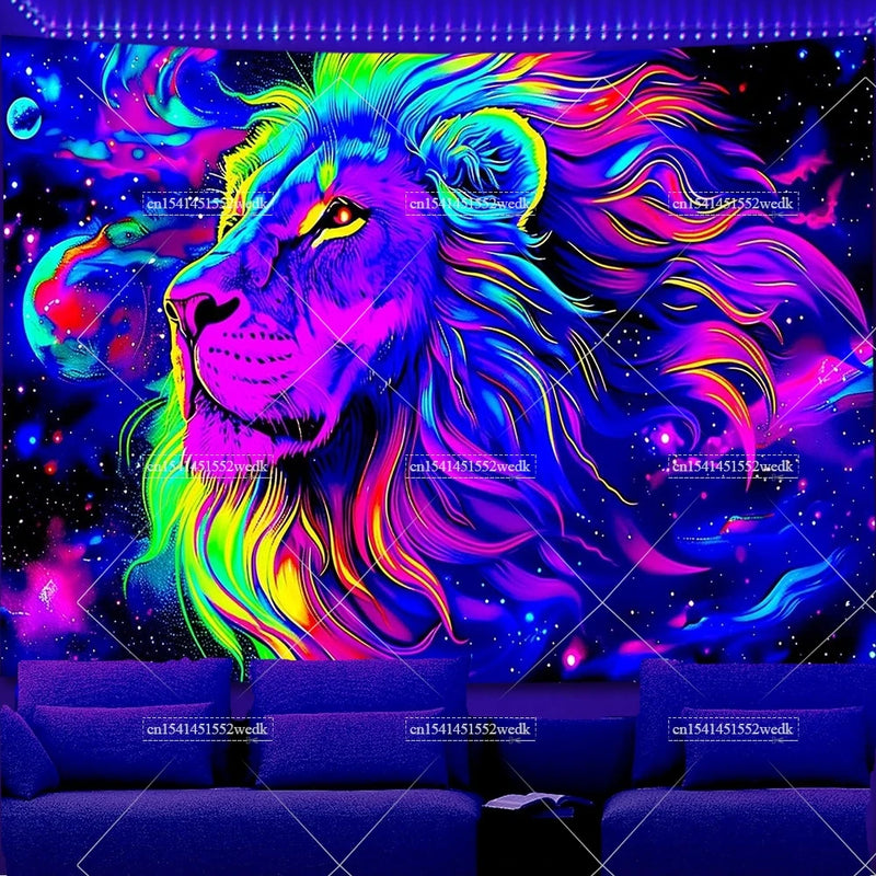 Schwarzlicht-Löwe-Wandteppich, Galaxie, Weltraum-Wandteppich, UV-reaktiv, leuchtet im Dunkeln, Schwarzlicht, Berg, Neon-Wandteppiche, Wanddekoration